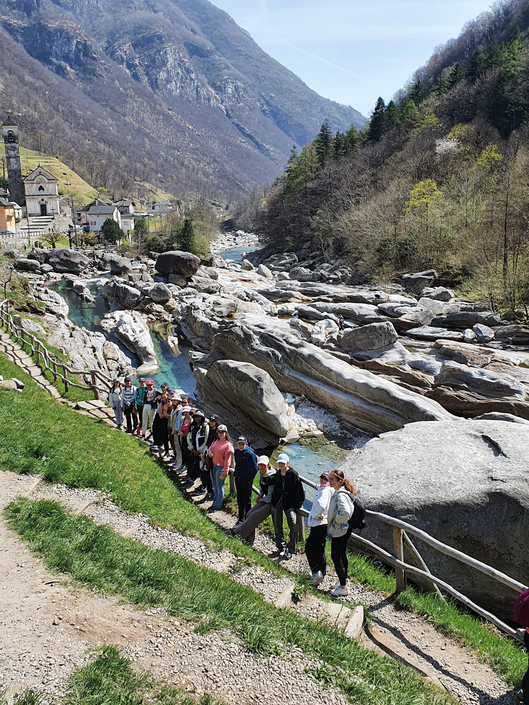 • Val Verzasca, voyage en bus impressionnant, paysage lunaire laissé par le lac vidé pour nettoyage, marche et activités diverses le long de la rivière assez calme pour un mois d’avril et Bobosco parcours.