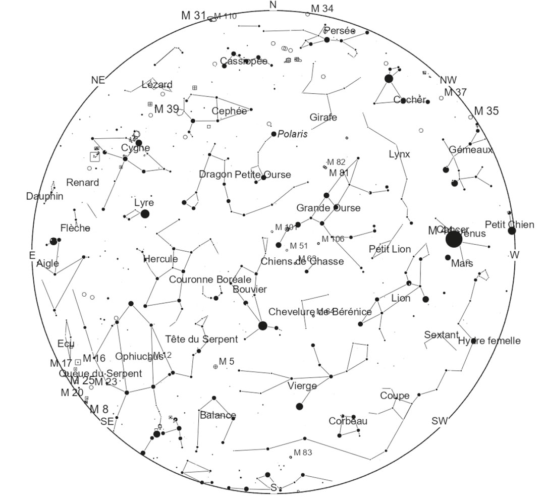 Elle représente une vue complète du ciel vu depuis la Vallée de Joux le 15 juin à 20h00 TU, soit 22h00 heure locale. Le centre de la carte marque le zénith, ses bords représentent l’horizon. Carte réalisée avec le logiciel «Carte du ciel» qui vous permet d’entrer votre position et de définir une date et une heure d’observation. Il vous fournira ensuite la carte du ciel correspondante.