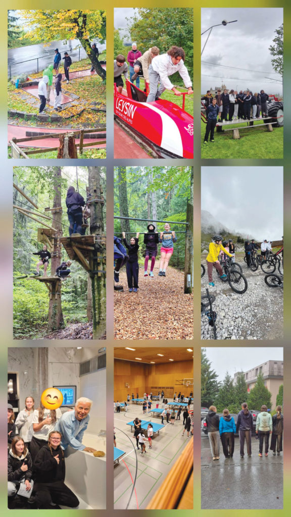 Comme chaque année, la volée de 11e est partie pour son dernier camp durant la semaine du Jeûne à la Maison du Sport à Leysin. Au programme, parcours d’accrobranches à Aigle, création d’un petit film, poussée de bobsleigh, piste Vita, mini-golf, dessin au fusain, descente de la Berneuse en « dirt scoot », tournoi de ping-pong, rallye, jeux de société, boom et visite du musée Chaplin à Corsier-sur-Vevey.