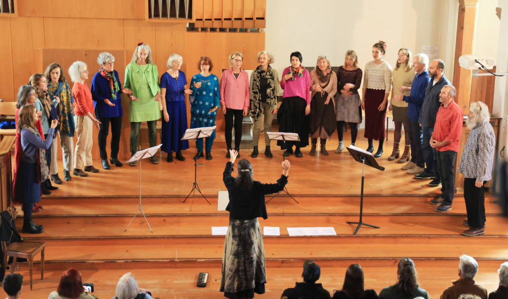 La directrice, naturelle, pleine de délicatesse, d’élégance, de simplicité, mais d’efficacité et de passion, s’accompagne parfois à la guitare ou de tambours. Sa direction est très agréable à voir. Elle participe aussi, associe sa voix en solo ou avec les chœurs (Félicitations !), et ceci en toute modestie. C’est elle qui trouve cet incroyable répertoire, à proposer à ses chanteurs et qui fait tous les arrangements.