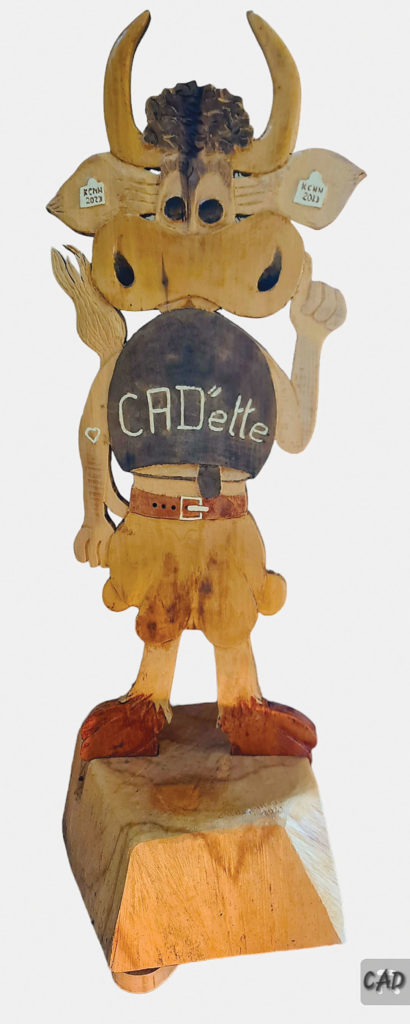 CAD’’ette c’est aussi une grande sculpture en bois avec la précieuse aide à l’ébauche d’Yvan Freiholz, et 3 effigies de grandeurs différentes selon leurs utilisations.