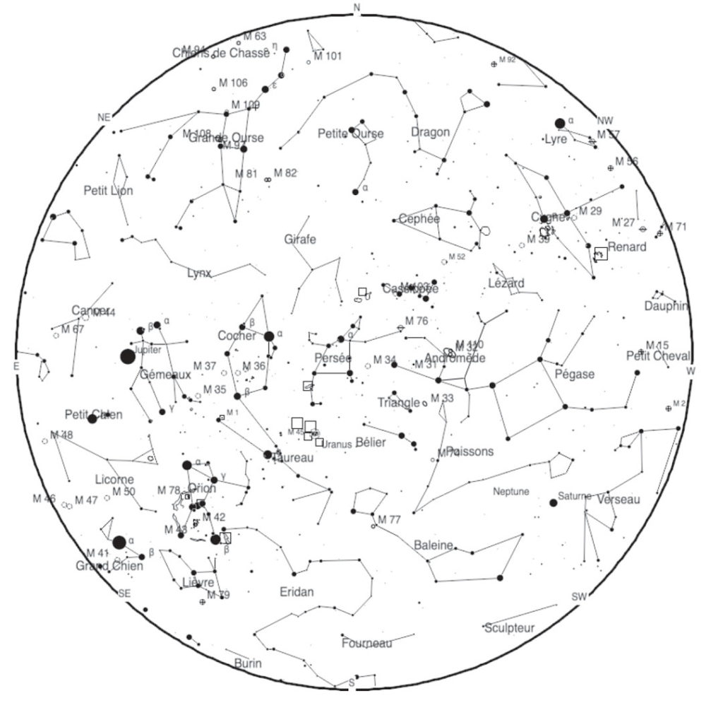 Elle représente une vue complète du ciel vu depuis la Vallée de Joux le 15 décembre à 21h00 TU, soit 22h00 heure locale. Le centre de la carte marque le zénith, ses bords représentent l’horizon. Carte réalisée avec le logiciel « Carte du ciel » qui vous permet d’entrer votre position et de définir une date et une heure d’observation. Il vous fournira ensuite la carte du ciel correspondante.