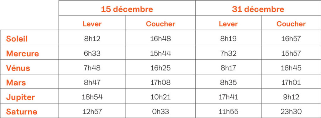 La table ci-dessous présente les heures de lever et de coucher du Soleil et des planètes visibles à l’œil nu pour l’Observatoire de la Vallée de Joux :