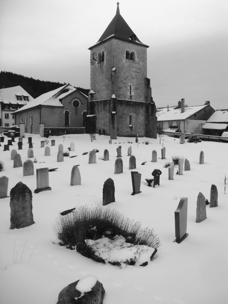 Et pour expliquer ce titre, revenons au site bâti de l’abbaye du Lac de Joux, l’espace entre la tour et le temple : lieu de passage pas vraiment attrayant, ni convivial dans son contexte. Mais son aménagement entre le temple et la plus ancienne construction de La Vallée, mérite une petite interprétation, de par sa configuration et les quatre portes qu’il offre.