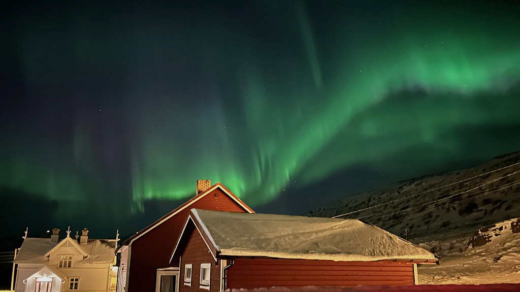 Luigi est au rendez-vous pour nous conduire jusqu’à Kongsfjord. Coup de chance, le chasse-neige a dégagé les congères et 36 kilomètres plus loin alors que la nuit est déjà noire, une aurore boréale s’agite dans le ciel. Le vent soulève la neige, l’accueil est glacial mais magnifique !