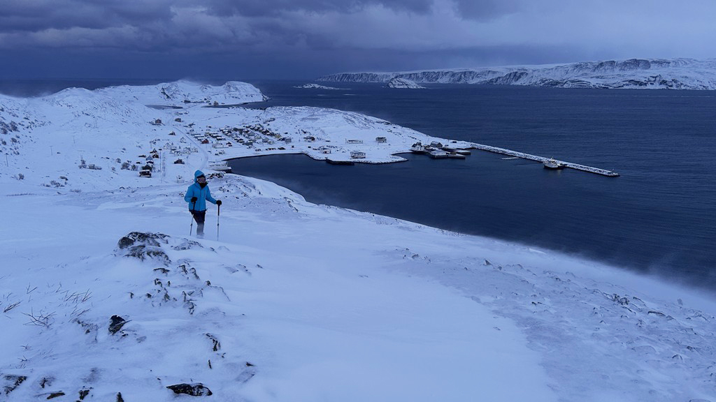 Kongsfjord, étrange village fantôme où presque toutes les maisons sont allumées, mais désertes. Une constante dans le Grand Nord norvégien où manifestement l’électricité ne coûte pas cher. Seule une quinzaine d’habitants se terrent, sans jamais se montrer. À part Margherita et Luigi, le charmant couple d’Italiens qui nous louent notre tanière, nous ne voyons jamais personne. Sauf un monsieur qui déblaie la neige devant sa maison et des voisins lettons qui nous font gentiment signe de la main, planqués derrière la fenêtre de leur cuisine. Ah, on oubliait la vieille dame finlandaise, dont nous avons découvert l’existence hier. Elle avait, comme nous, commandé le service public de taxi collectif pour aller faire, sans dire un mot, ses courses à Berlevåg. Parce qu’ici, non seulement il n’y a personne, mais il n’y a rien.