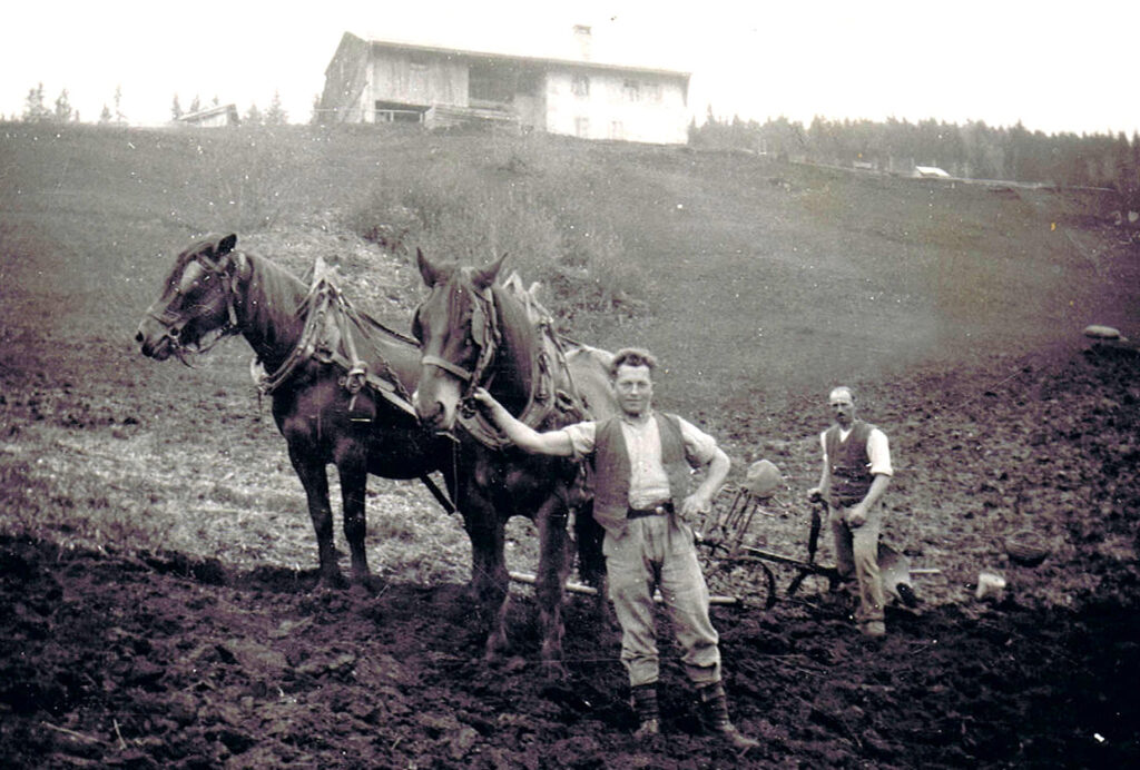 ↖ Les labours à Ique-Dessous vers 1940. Photo Arlette née Berney à L’Abbaye.