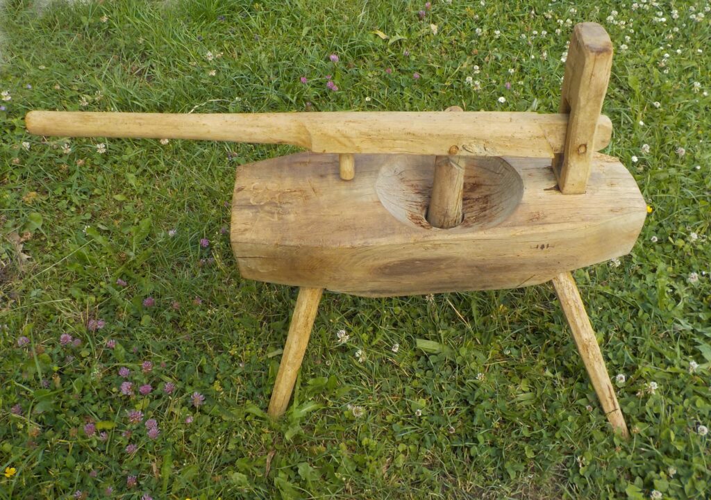 ↖ Pétrin ou presse pomme de terre. Daté de 1837, époque où il était sans doute d’un usage régulier. Collection Patrimoine de la Vallée de Joux. Le trou est plus fin sous le tronc afin que l’on puisse obtenir déjà comme une purée qui sera recueillie dans un bac.